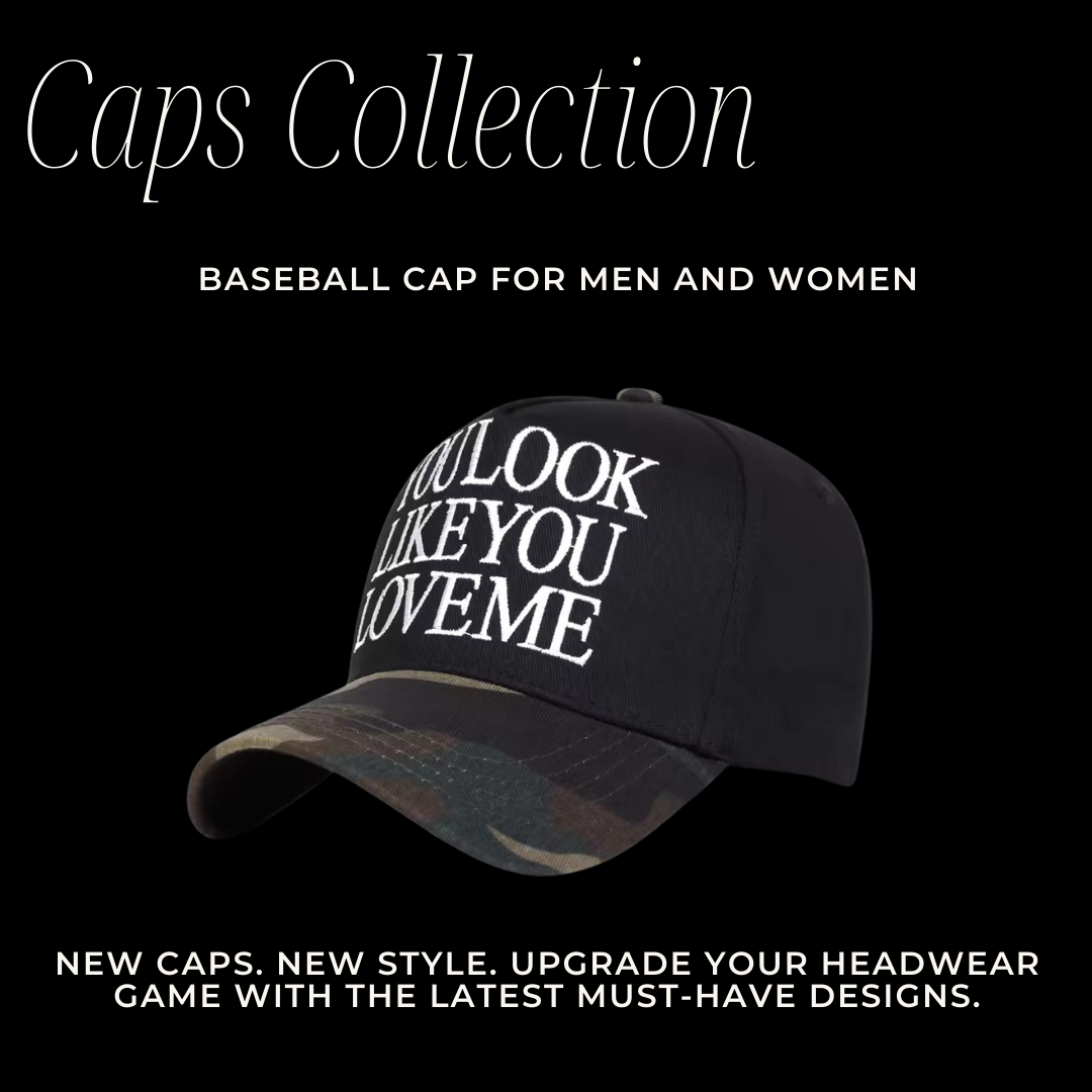 Elevate your casual style with the Unisex “YOU LOOK LIKE YOU LOVE ME” Embroidery Baseball Cap. Designed for both men and women, this adjustable cap blends fashion-forward appeal with everyday functionality. The bold embroidered statement on the front panel adds a playful, eye-catching touch, while the camouflage-patterned brim enhances its unique aesthetic. Perfect for spring and autumn wear, this cap also provides reliable sun protection for outdoor activities.